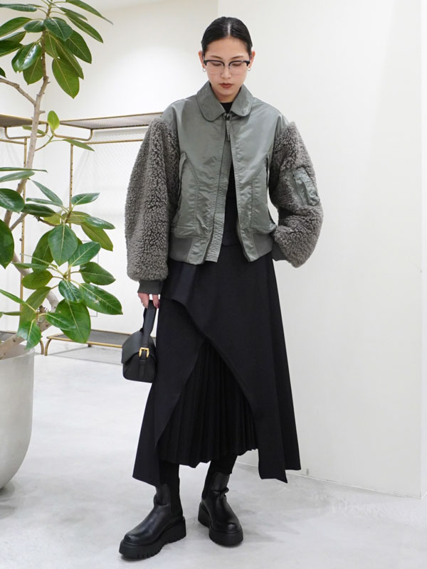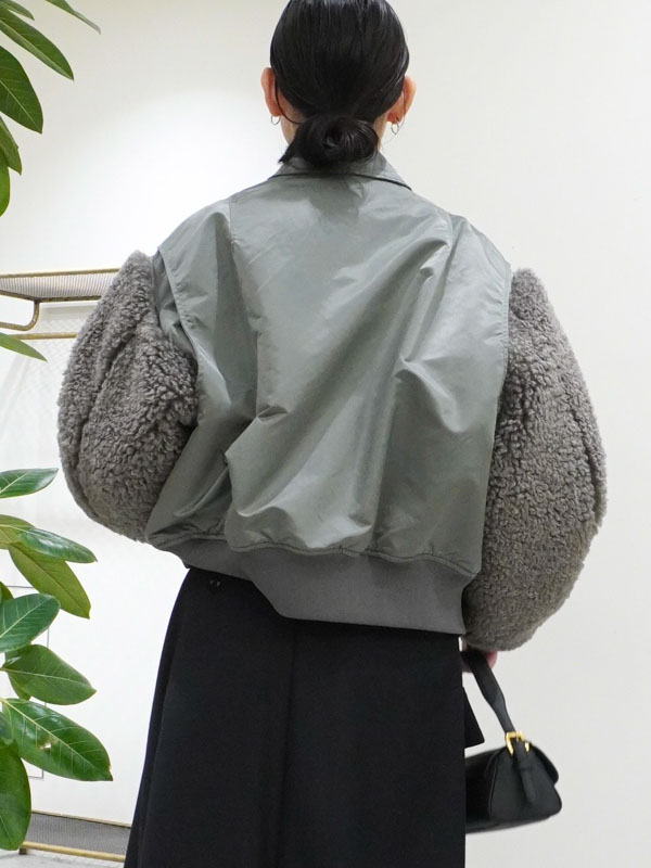 身頃は光沢感のあるナイロン素材、袖にはボリュームのあるボアを切り替え、異素材の質感コントラストが魅力の一着です。