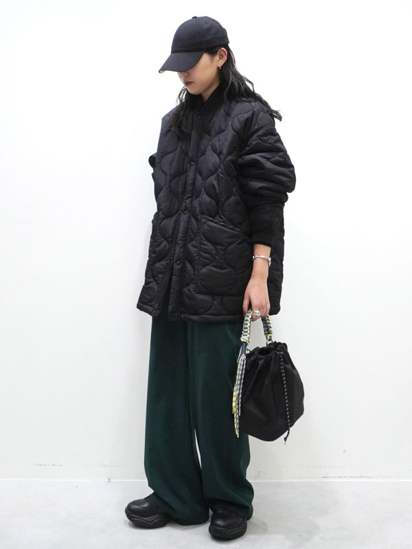 キルティングジャケットのボリューム感を活かしつつ、深みのあるグリーンのワイドパンツでカジュアルすぎず、モードな雰囲気に仕上げたコーディネートです。