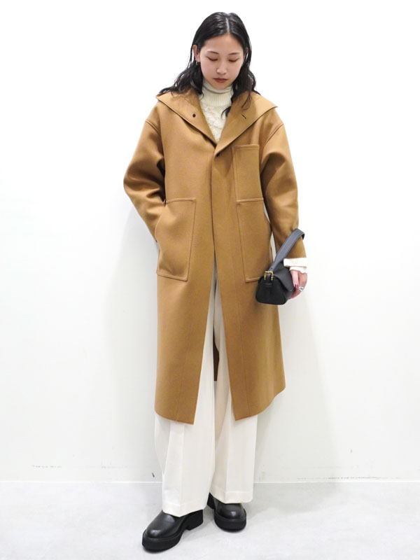 ニットとパンツをホワイトでまとめ、アウターのキャメルがぐっと引き立つバランスに仕上げました。