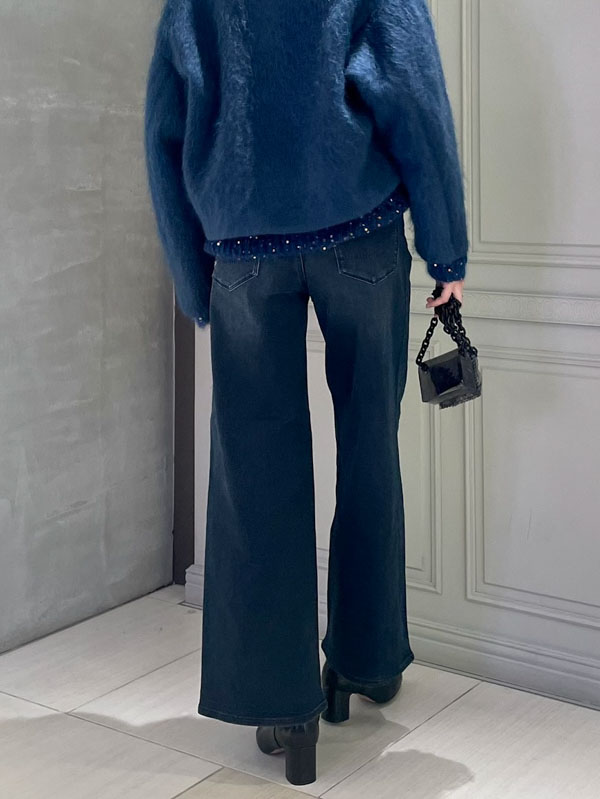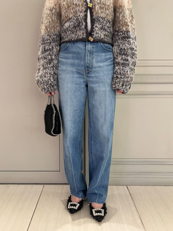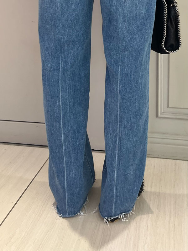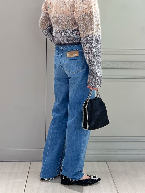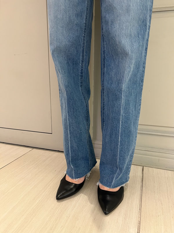 裾は切りっぱなしでカジュアルな印象ですが、膝下かけてセンターラインが入っており、全体的にスッキリと見せてくれる美脚デニムです!