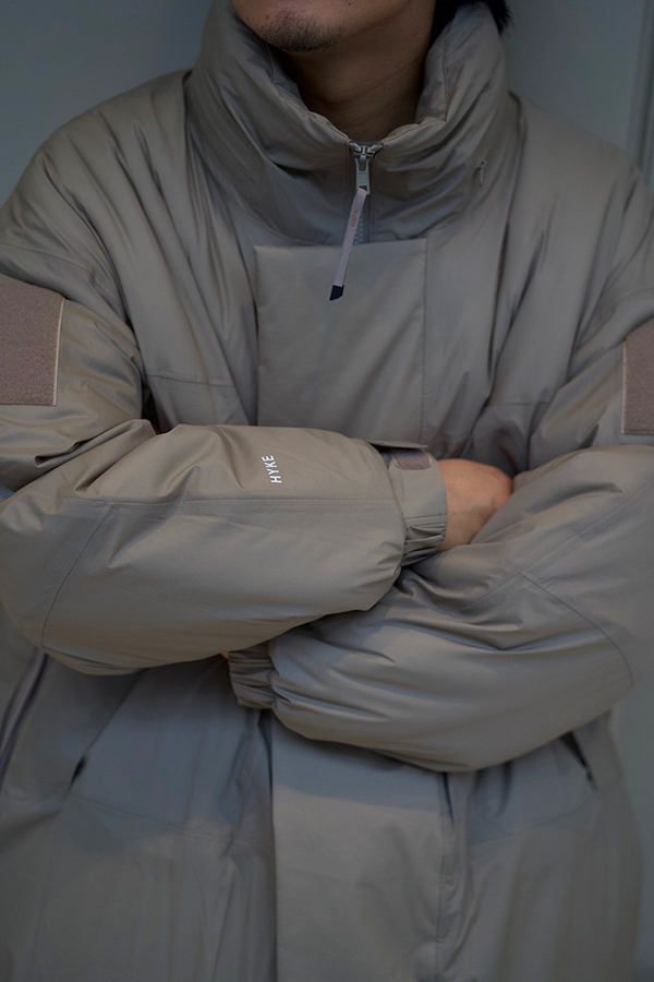 右袖にはHYKE(ハイク)、バックスタイルにはPERTEX(パーテックス)のロゴ入り。ポケット内部や裾のドローコードでシルエットに変化を付けられるところも嬉しいポイントです。
