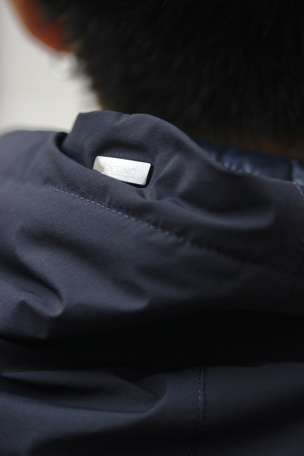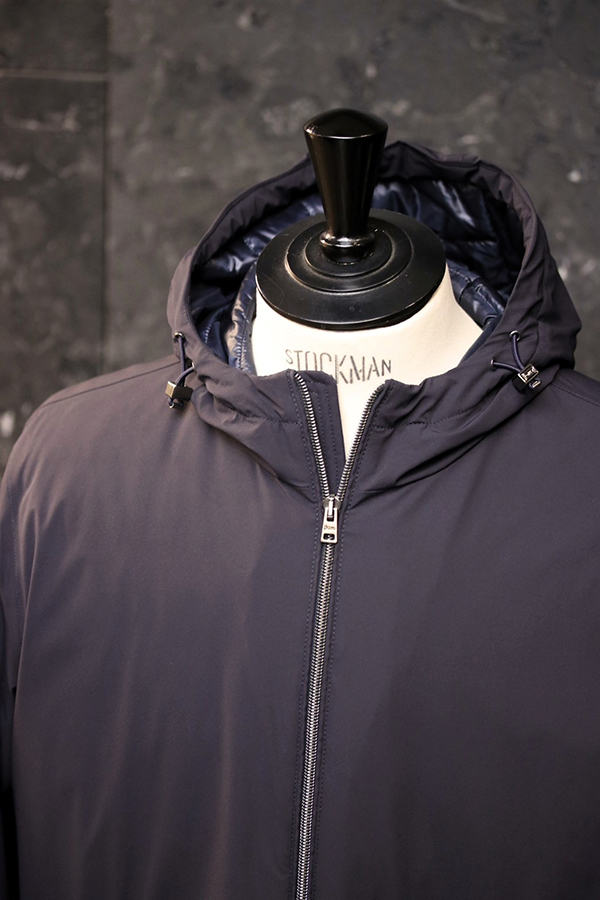 フードは上まで閉めるとスタンドカラーのように首周りを覆う作りになっています。防寒性がありながらも綺麗な仕立てによりクラシックな雰囲気を損なっていないところがさすがだなと感じさせる作りです。