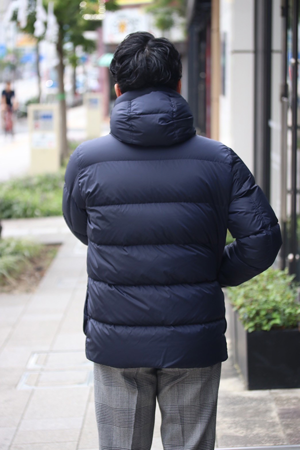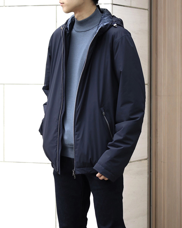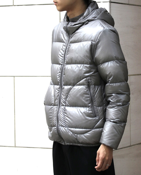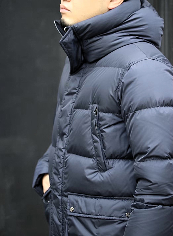 HERNO(ヘルノ)定番の強撥水ナイロンを使用したダウンフーディーです。見頃に少しゆとりをもたせ、着丈が長めに設定されているためリラックスした着心地です。少し余裕のあるシルエットがダウンの存在感を引き立てます。
