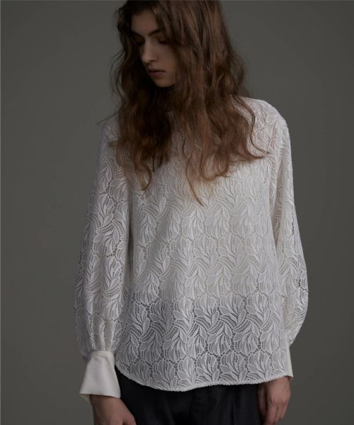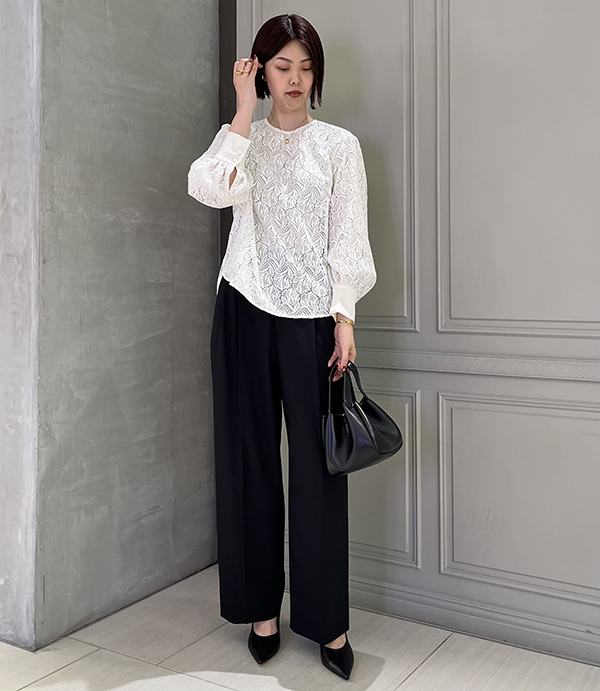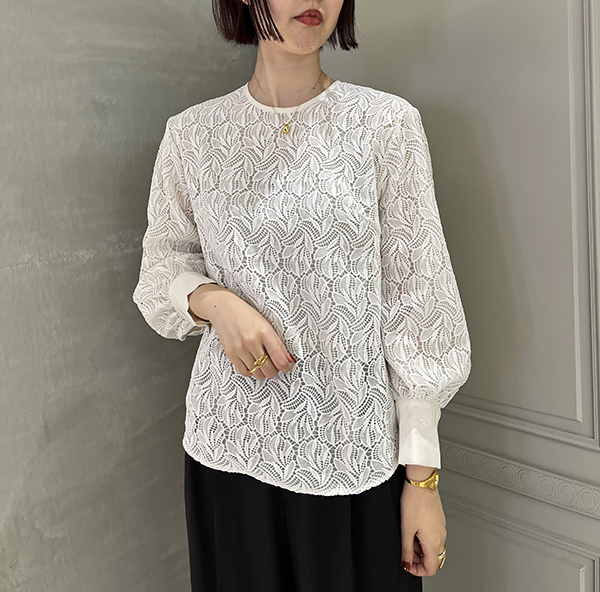 ボタニカル柄のレース生地をたっぷり使用し、カフスの部分は贅沢にシルク100%で作られたこちらのブラウス。ベーシックな形なため、素材と縫製のクオリティの高さがより際立ちますね。