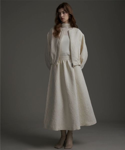 フランス製のラメ入りのジャガード素材を使用した丸いフォルムが可愛らしい、ブルゾン型のジャケットとややハリ感のあるふんわりとしたボリュームシルエットのフレアスカートです!