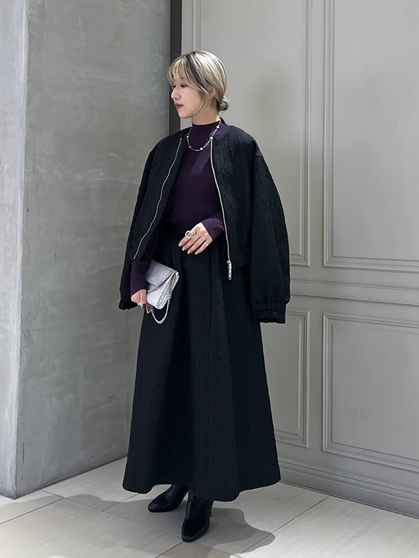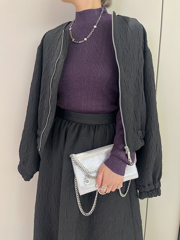またインナーにカラーニットを差し込んでも可愛いです。今回はパープルのラメニットを着てみました!ジャケットからちらっと見えるパープルの色味がコーディネートを引き締めてくれます。
