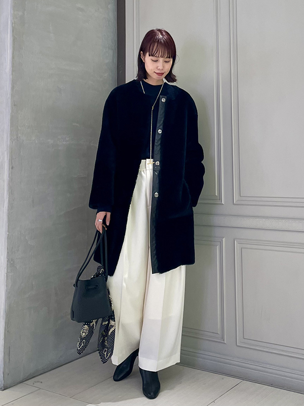 今回はゆるっとした綺麗めワイドパンツと合わせました。また大ぶりなアクセサリーを一緒に着用することで、一気に高感度な雰囲気になります!