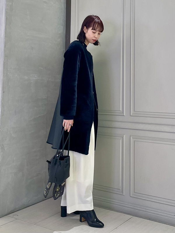 カジュアルすぎないファーなので、大人の女性にピッタリ。白いパンツと合わせることでスタイリングも女性らしく洗練された印象になります。