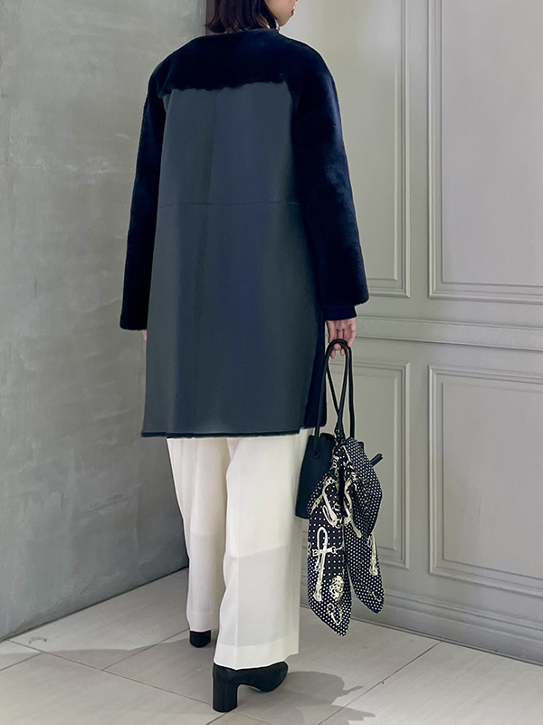 レザーとファーのリバーシブル着用可能で、背面にはレザーの切り替えが施されています。