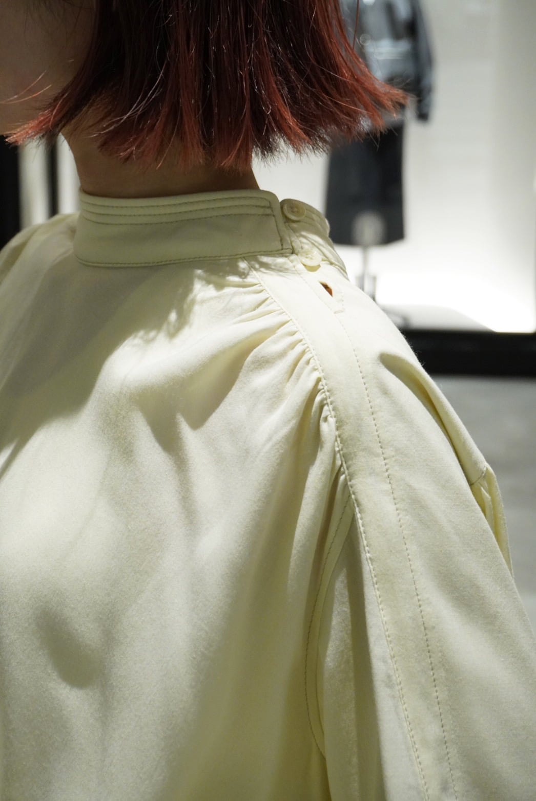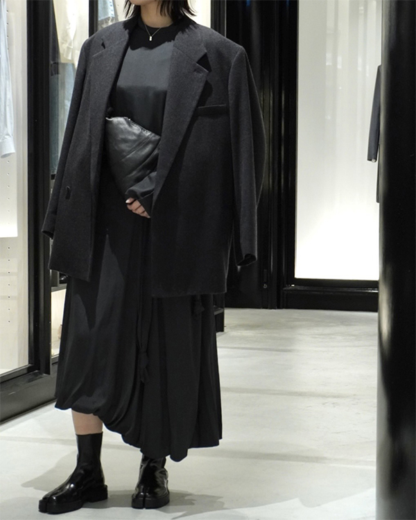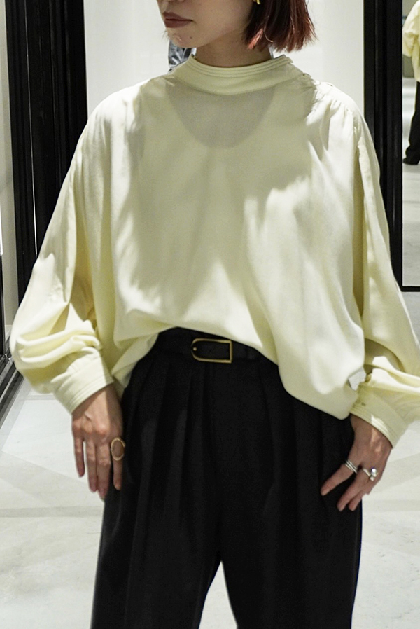 ウールレーヨンの素材で、生地のしなやかさと優しい肌あたりが魅力。肩のボタンディティールは開けて鎖骨を見せてた着こなしも素敵です。
