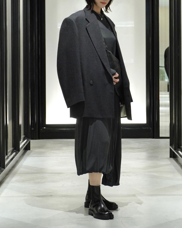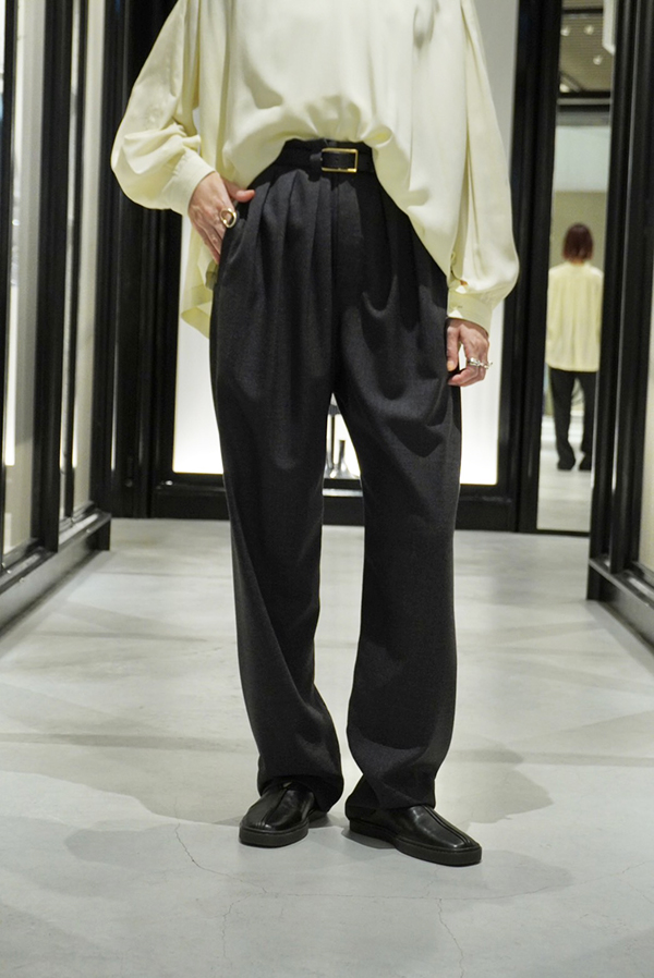 パンツは、タックが細かく施されたルーズなシルエット。ウエストを太いベルトできゅっと絞ることで着こなしにメリハリを出してくれます。裾にかけてややテーパードがかかったシルエットなので、寸胴に見えずこなれた印象になるデザインは流石です。