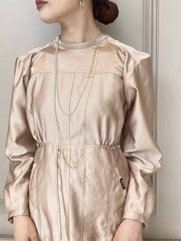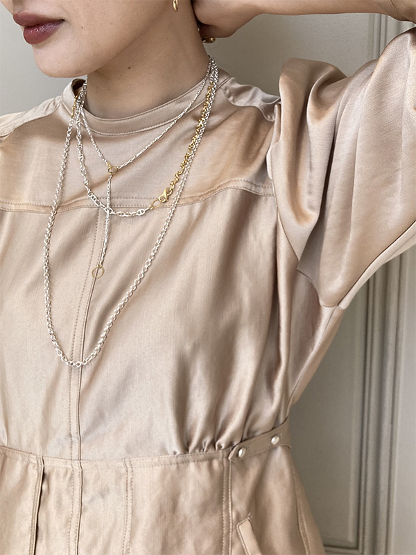 長さ調整が可能で、程良いボリュームのネックレスと、デザインチェーンを使用したネックレスとのセットアイテム。ゴールド、シルバーのミックスチェーンで様々な組み合わせで楽しめる変幻自在な自由度の高いネックレスです!