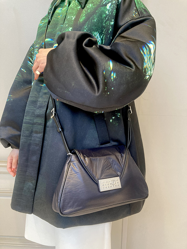 滑らかなナイロンを使用し、上品な光沢感があります。アイコニックなメタル製ナンバリングロゴがポイントです。
