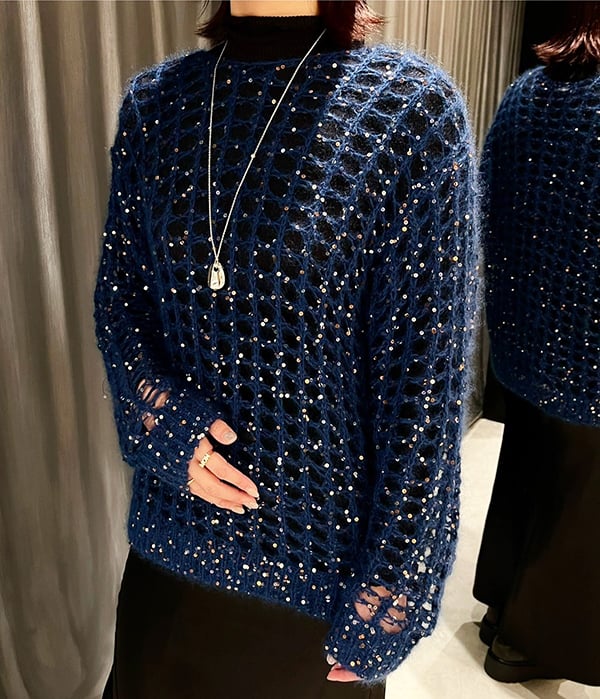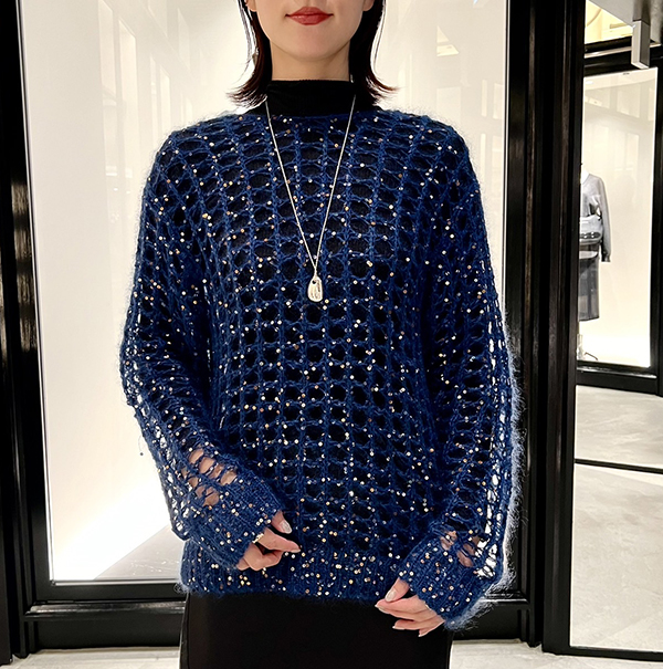 まずは「CINOH(チノ)」のスパンコールモヘアレースニット!