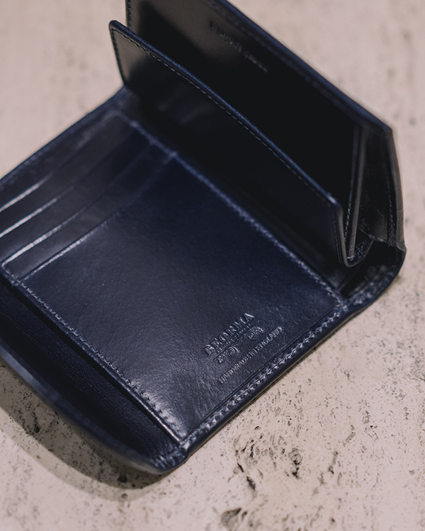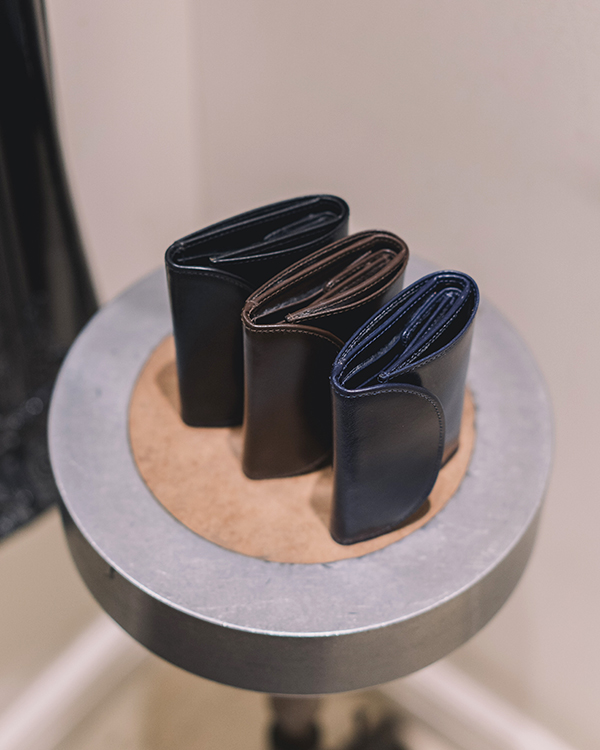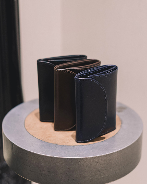 今回ご紹介する三つ折り財布は、黒、紺、茶の3色展開。それぞれ落ち着いた色味で、どの世代の方にもマッチします。上質なレザーが使い込むほどに柔らかく手に馴染み、経年変化も楽しめるのが特徴です。