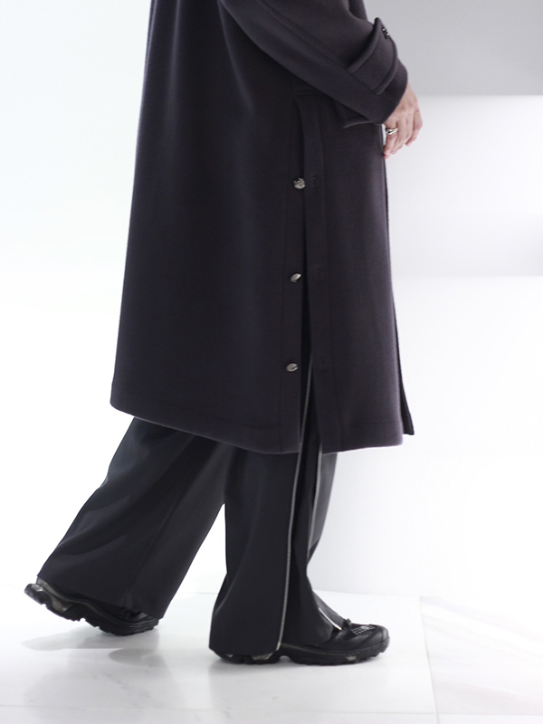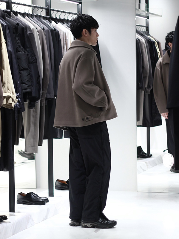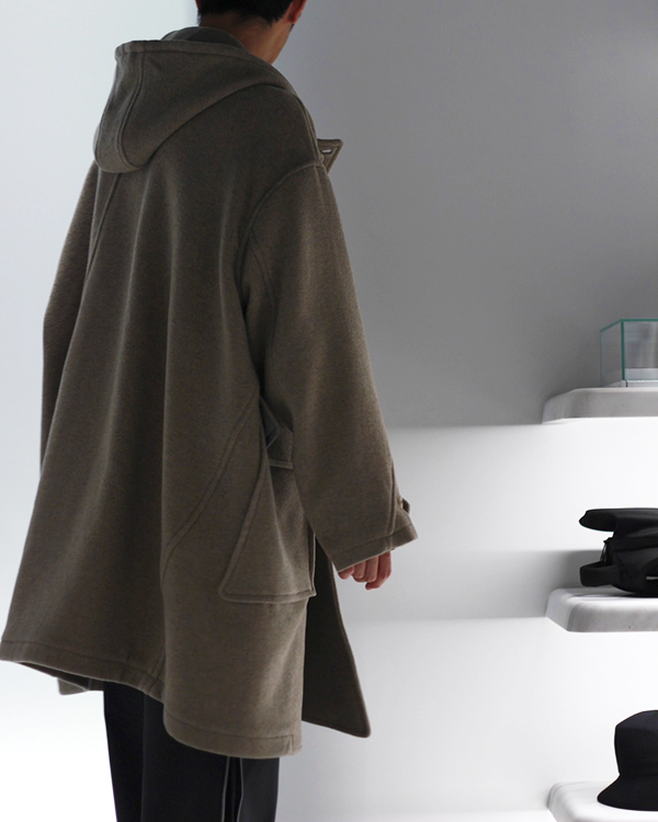 全体的に時計回りにツイストさせ、重く見えがちなダッフルコートに動きを加えているこちらのアイテム。