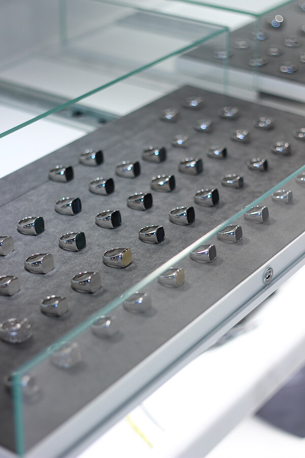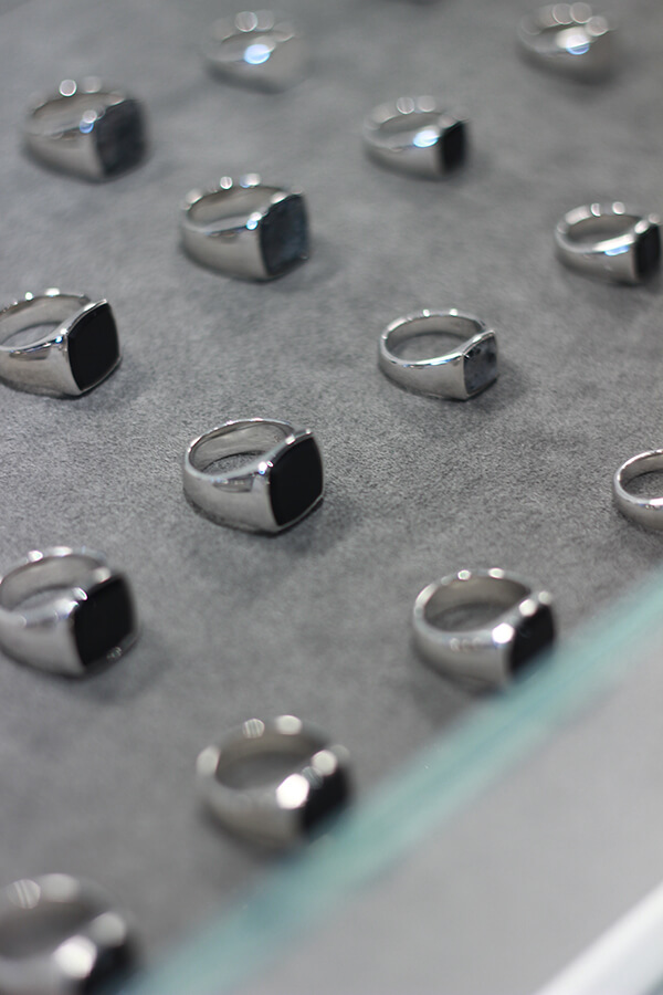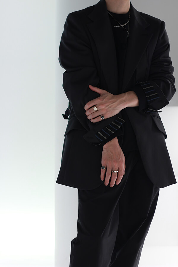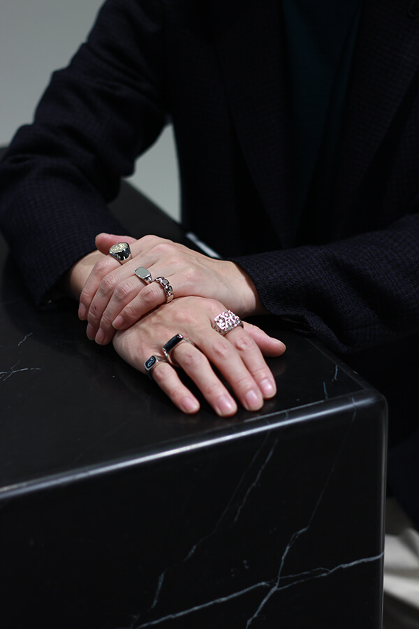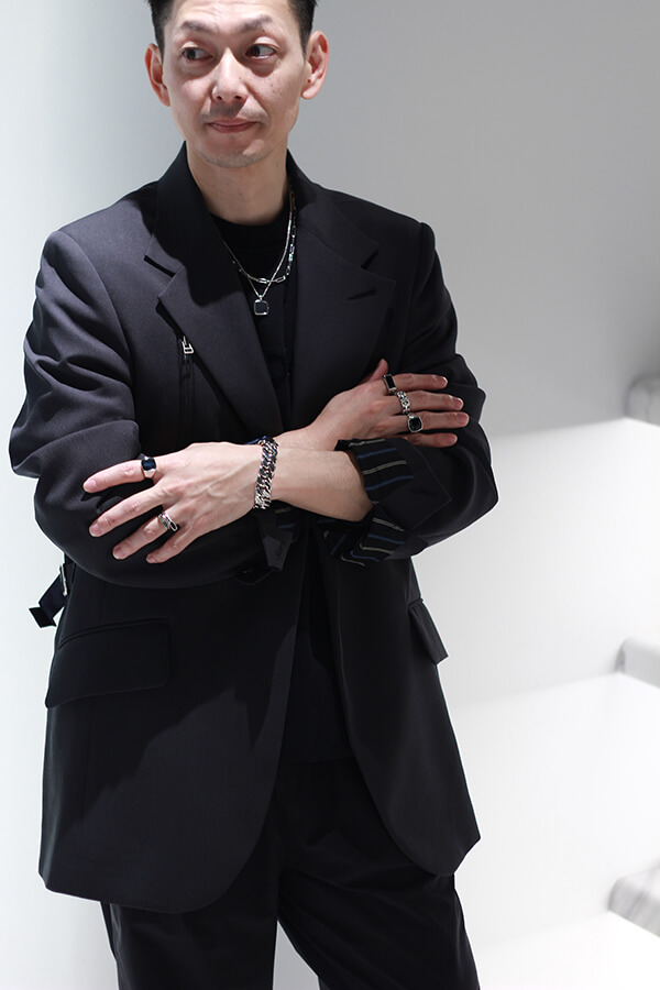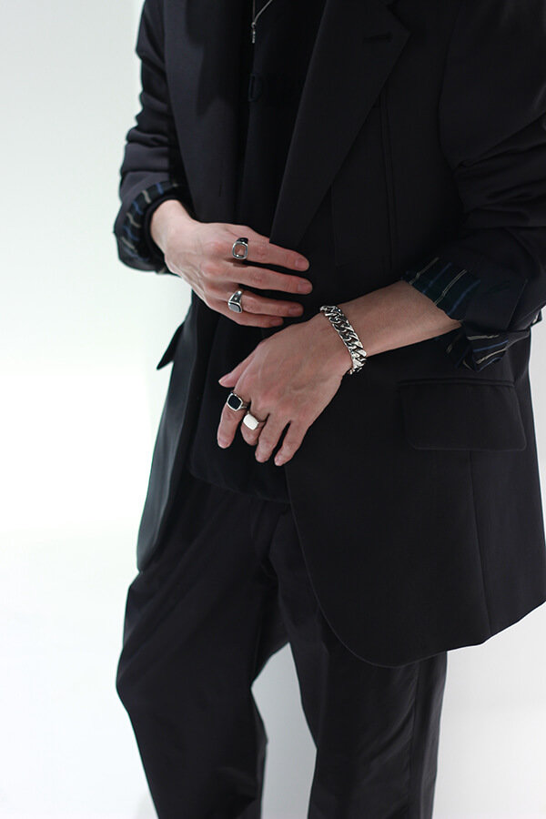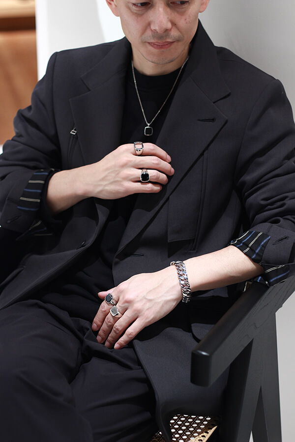 ストーンは存在感があり、力強さも与えてくれるのでテーラードジャケットを用いた、クラシックなスタイリングにも取り入れやすいです。