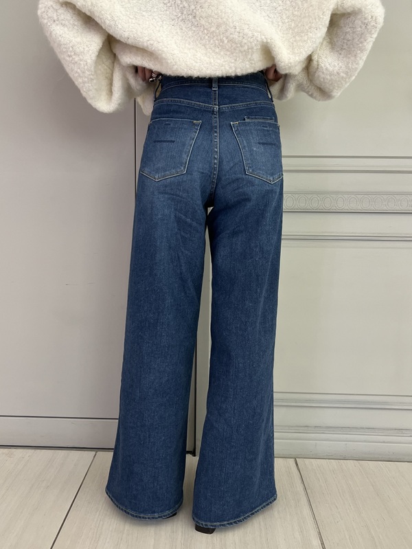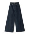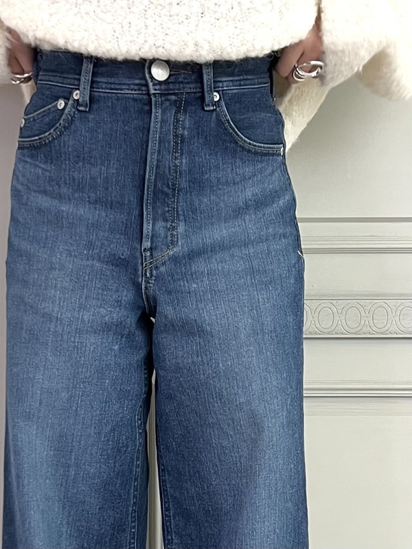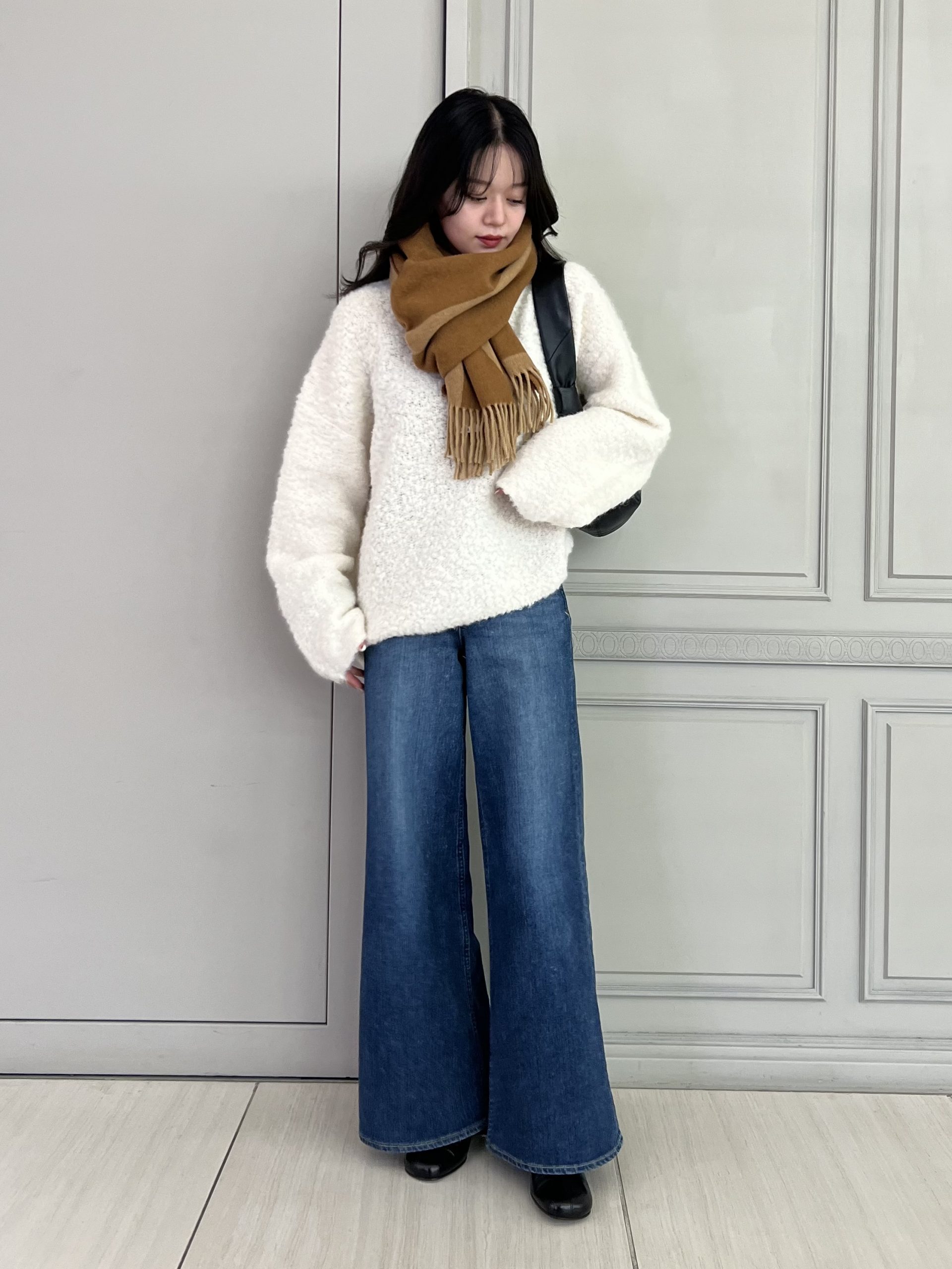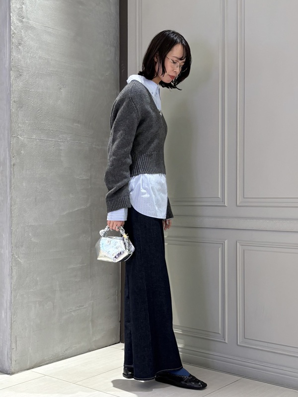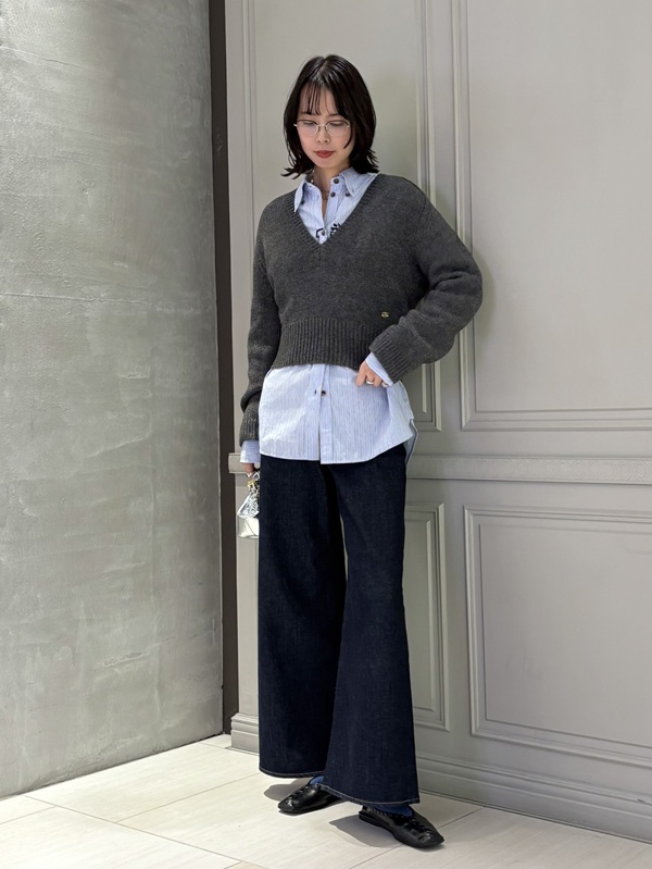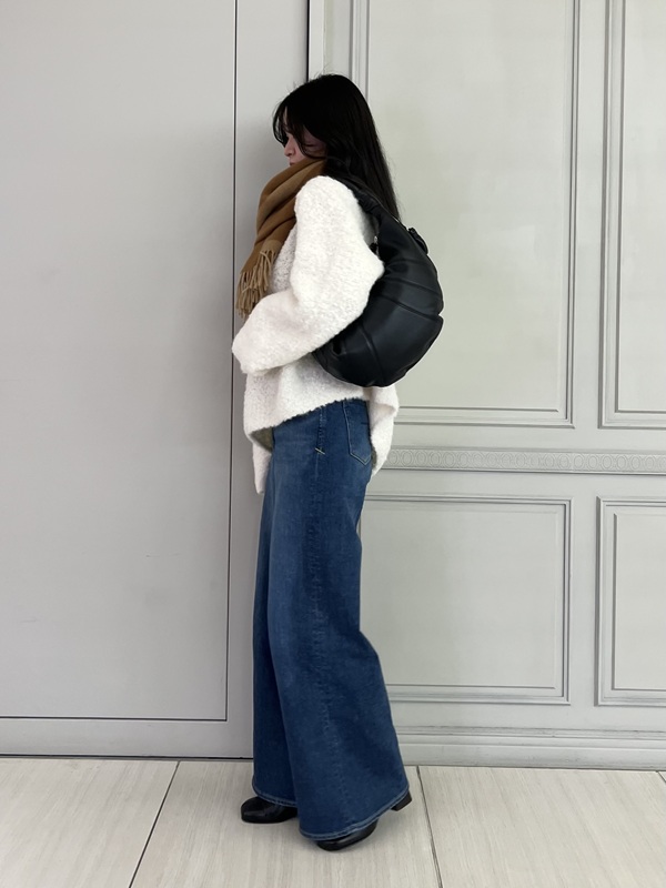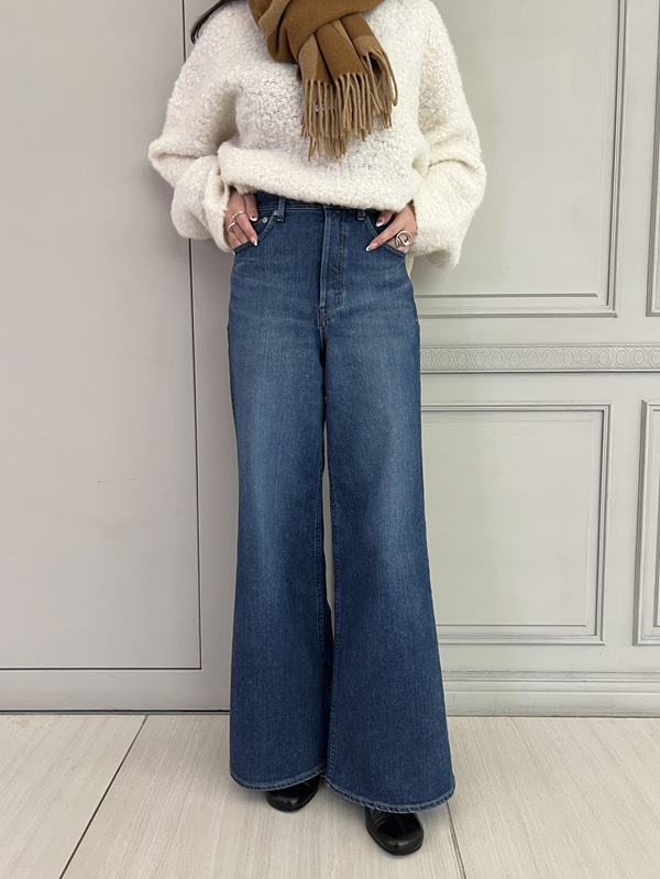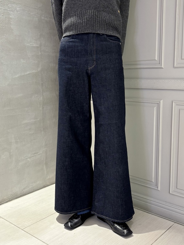 ワイドフレアデニムの縦のラインが強調され、重ね着でもすっきりとしたバランスを保ってくれます。