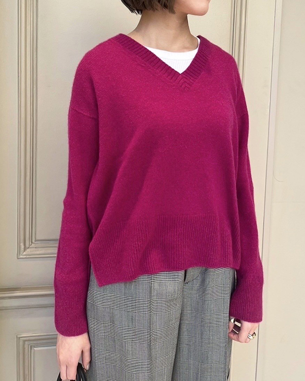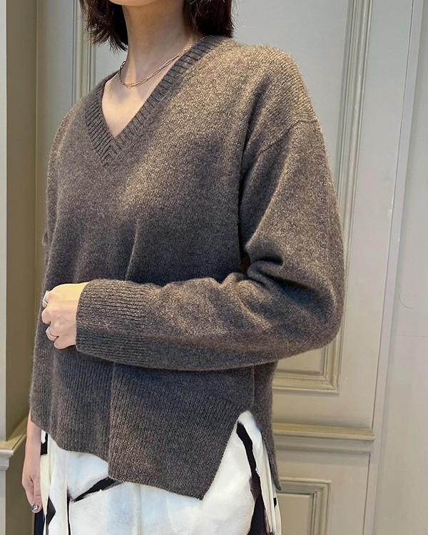 ニットにはサイドスリットが入っているので、シャツやブラウスなどの重ね着も楽しみやすく、雰囲気もがらりと変えることができます。