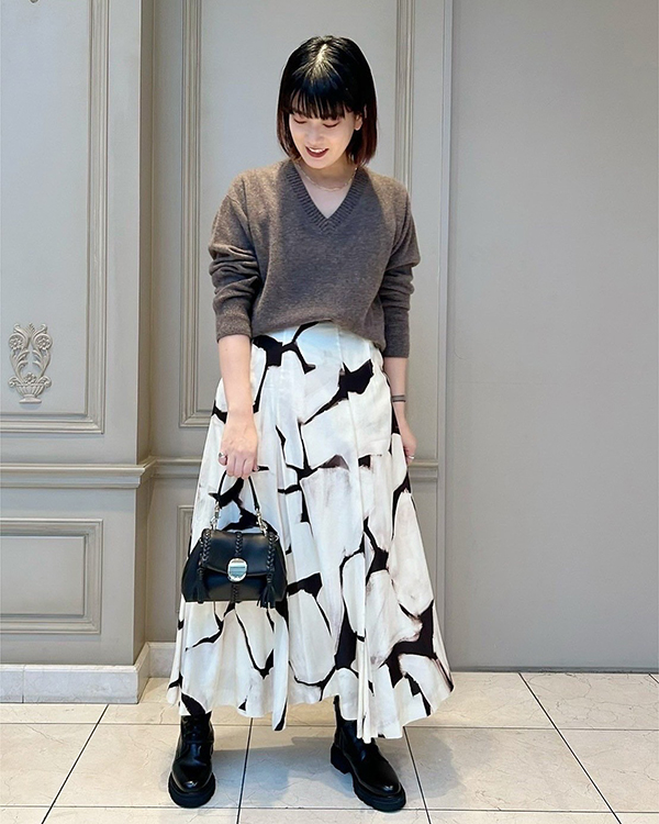 スカーフは難しいと思われる方も多いですが、手始めはニットと同系色のスカーフから始めるとまとめやすいです。ひとつ小物を増やすことでワンランク上のオシャレを演出できます。