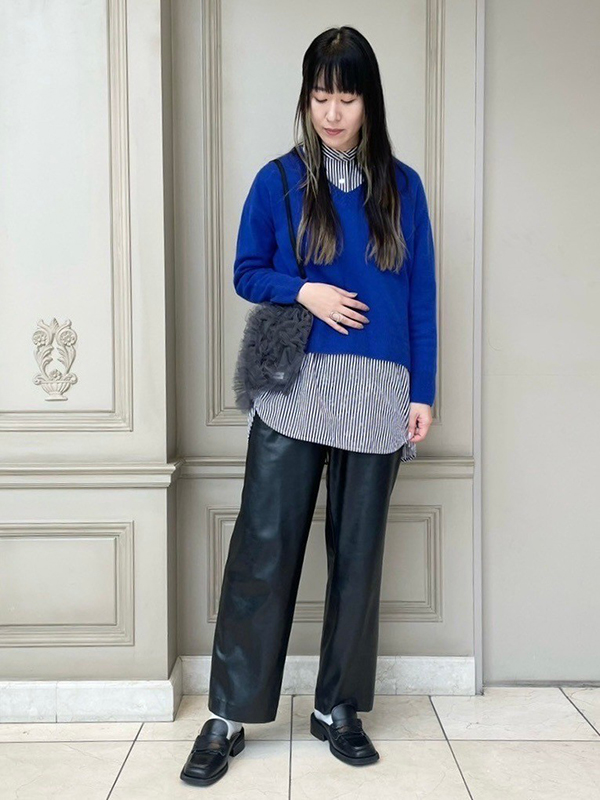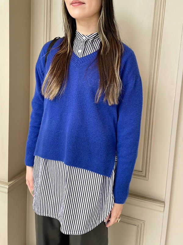 ロイヤルブルーのような鮮やかなブルー。シャツと重ね着しマニッシュさを意識したコーディネート。