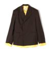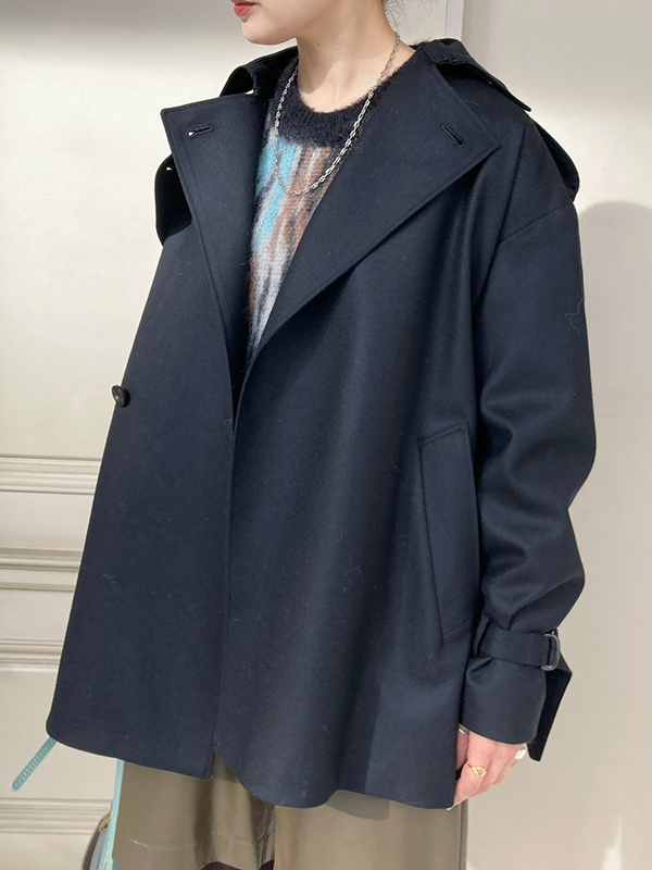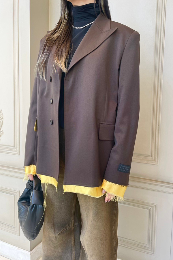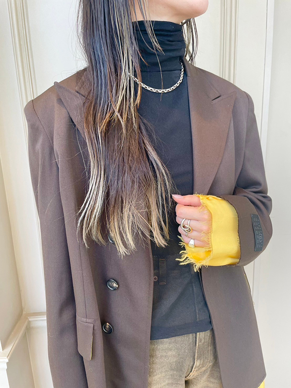 MM6 Maison Margiela(エムエムシックス メゾン マルジェラ)のジャケットは、贅沢なウールを使用したイタリア仕立て。パッド入りのショルダーと、裾や袖からのぞく裏地の切りっぱなしデザインが、ブランドらしい遊び心を感じられるアイテムです。お袖が長めなので私のような長身さんには嬉しいです(笑)
