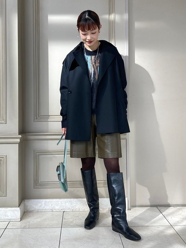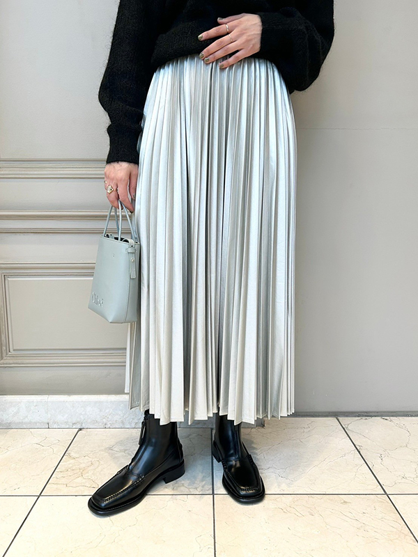 コーディネートはマイカアンドディールの柔らかな雰囲気の畦ニットとシルバーのエコレザースカートで素材のメリハリを持たせています。
