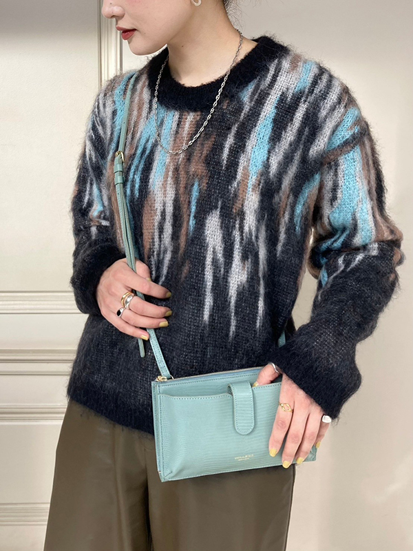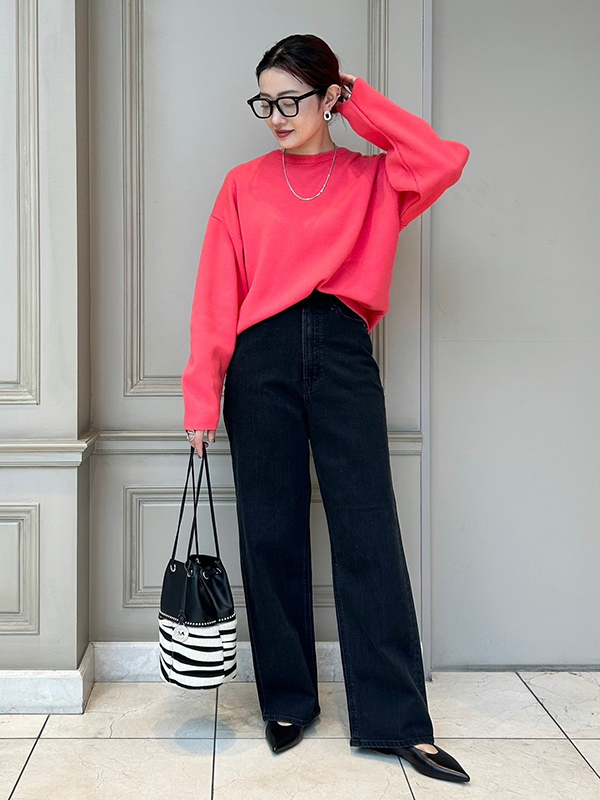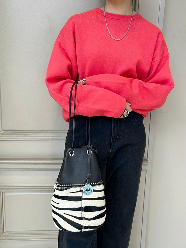 ブラックのウォッシュデニムでカラーのコントラストをつけて、MARCO MASI(マルコマージ)の柄のバッグで馴染ませています。