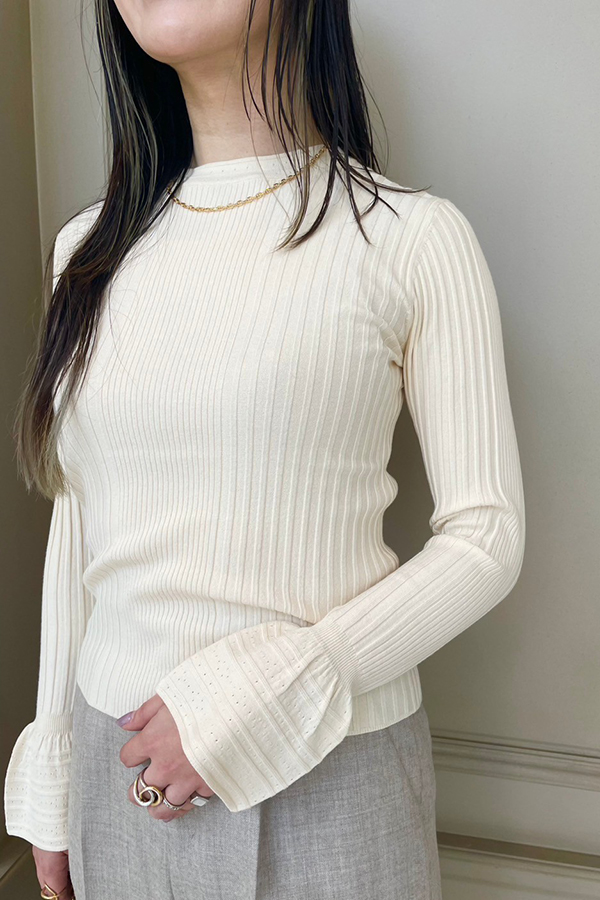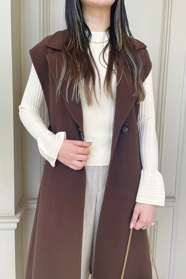 インナーに着ているパリゴのニットはフレアな袖口の透かし編みデザインがとても可愛い。洗濯可能で1枚でもインナーとしても様になるので、ヘビロテ間違いなしのアイテムです!