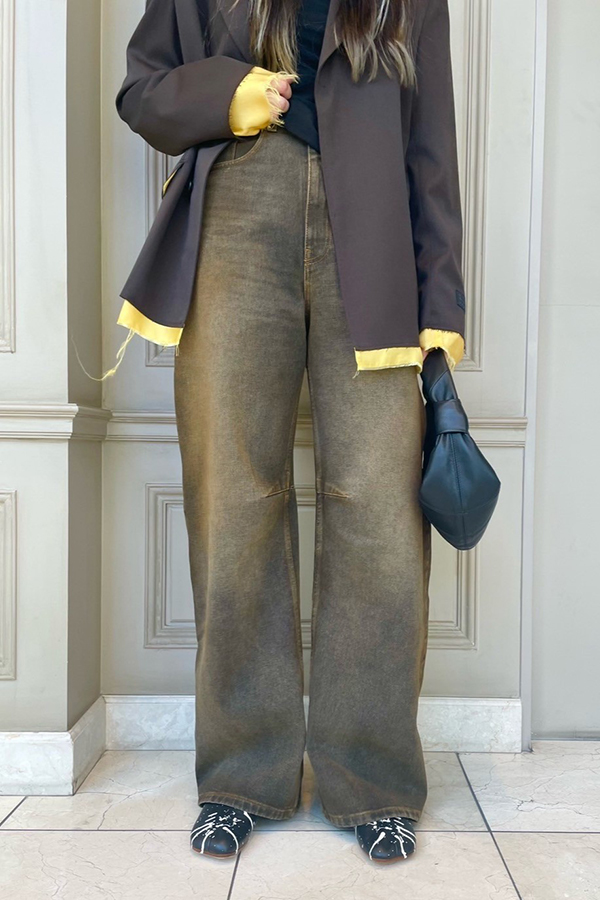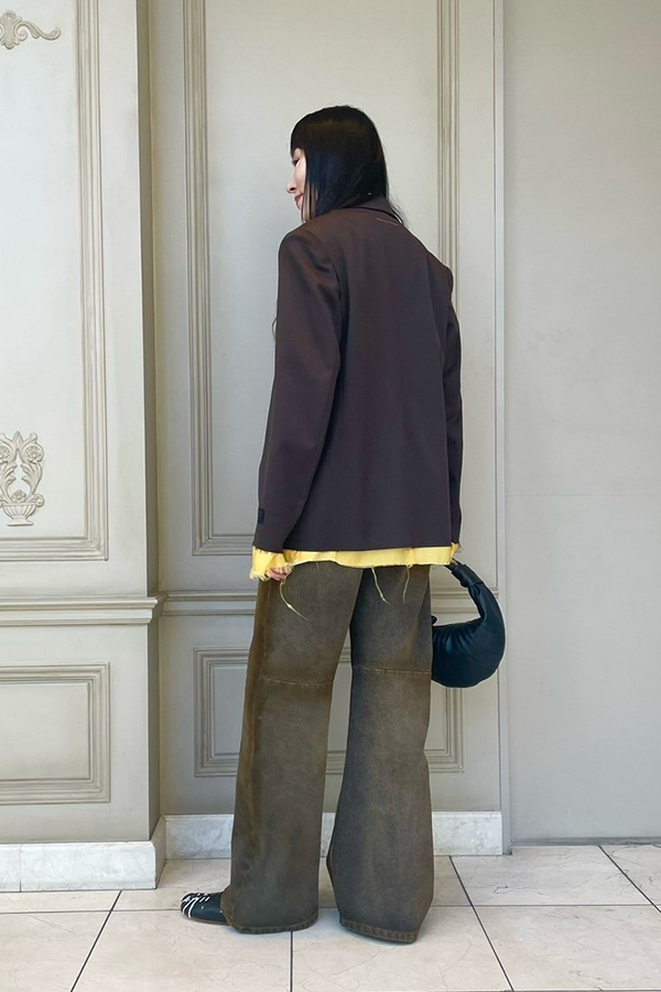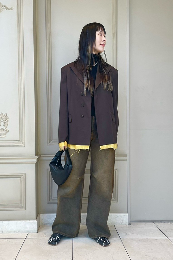 こちらは同ブランドのデニムでブラウンカラーコーディネート。ペイントの施されたアナトミックバブーシュを合わせてエッジのあるスタイリングにまとめています。