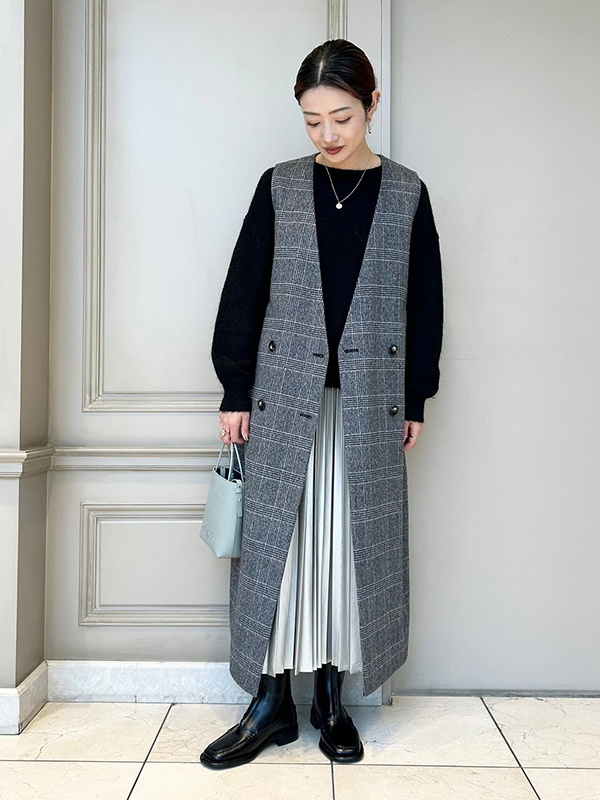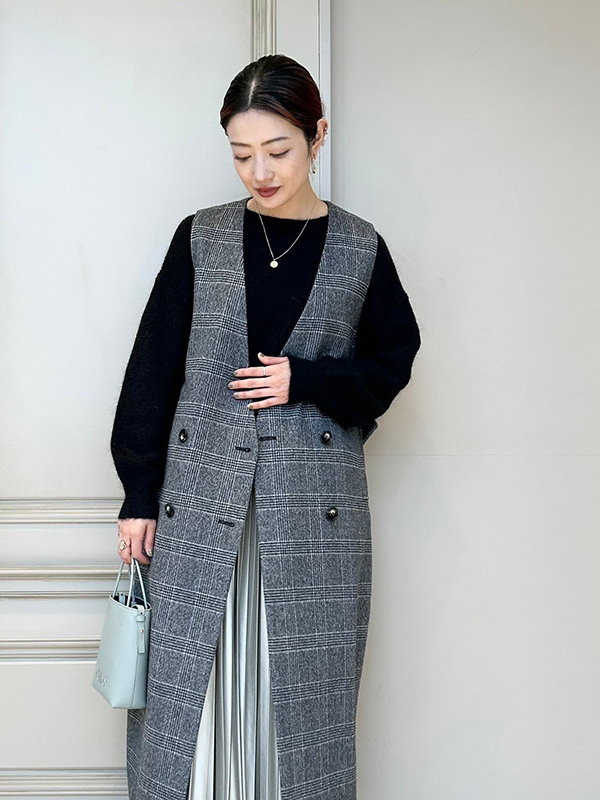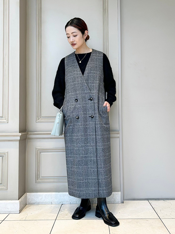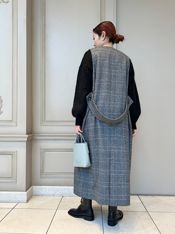 SACRA(サクラ)のワンピースは、前を開けてジレとして着用出来るアイテム。上質なコートのようなしっかりとした生地で、柔らかな風合いと上品な光沢感があります。上質なグレンチェックビーバー素材は、一目見て「良い物」と感じられる素材で、セールでゲットできるのはかなりお買い得感を感じさせてくれます!