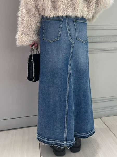 デニムパンツをリメイクしたようなデザインのロングスカートです。