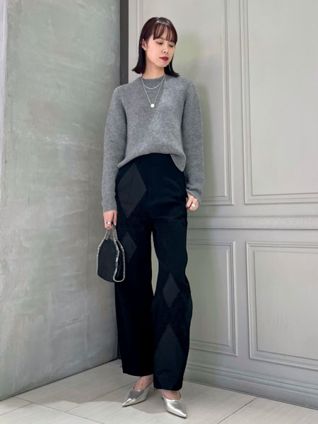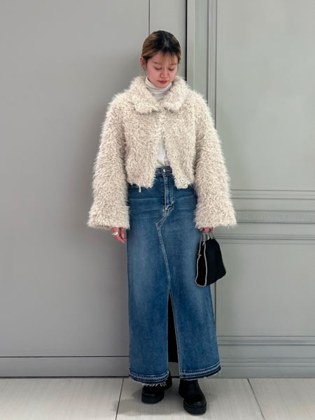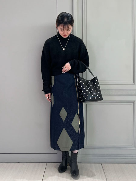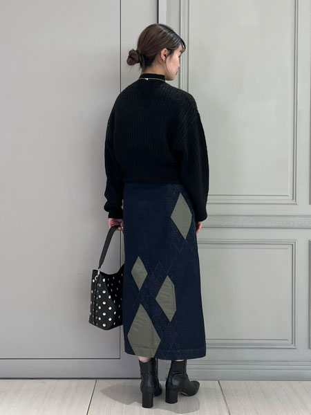 スリットが長いので、ロングブーツやタイツなど足もとに変化をつけて楽しめるのもポイント。