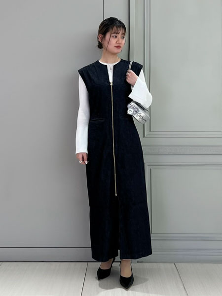 ゴールドのフロントジップが特徴的なストレートシルエットワンピース。