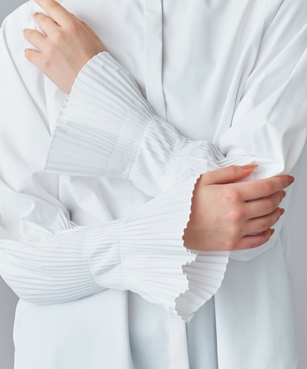 袖のプリーツデザインが目をひく長袖ブラウス。