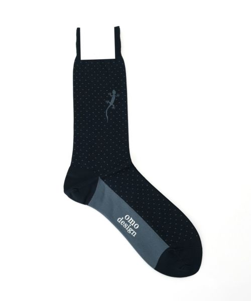 片足に幸運のモチーフであるトカゲのデザインが入ったomo design(オーエムオー デザイン)のソックス。ソックスをアクセサリーとして楽しむをコンセプトに MADE IN JAPAN にこだわり丁寧に編み上げた仕上がり。84/2のエジプシャンコットンを使っているため繊維長が長くシルクのような光沢感と強度もあり毛羽たちにくい仕様になっています。