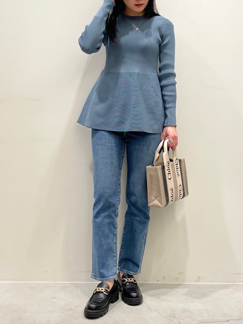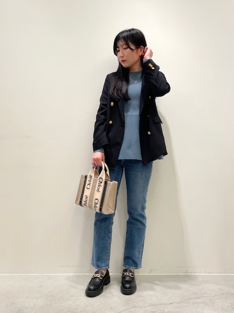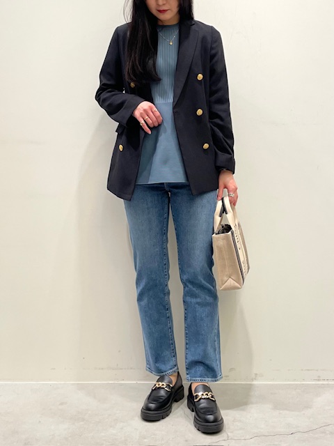 薄手なので、細身なジャケットの中にも合わせやすいです。ストレートのデニムと合わせてフェミニンに。