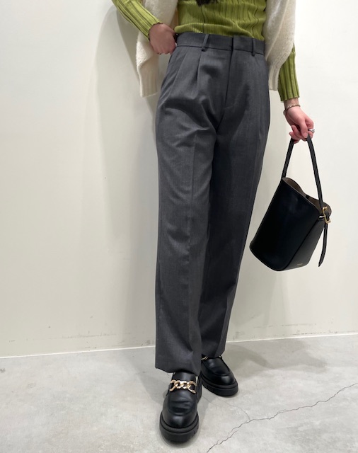 太めのテーパードシルエットでオンにもオフにも活躍するきれいシルエットなパンツ。表地はウール100%ですが、スーツと同じギャバジン素材のため起毛感はなくまだまだ活躍できそうなアイテムです!セレモニーシーズンにもおすすめです。