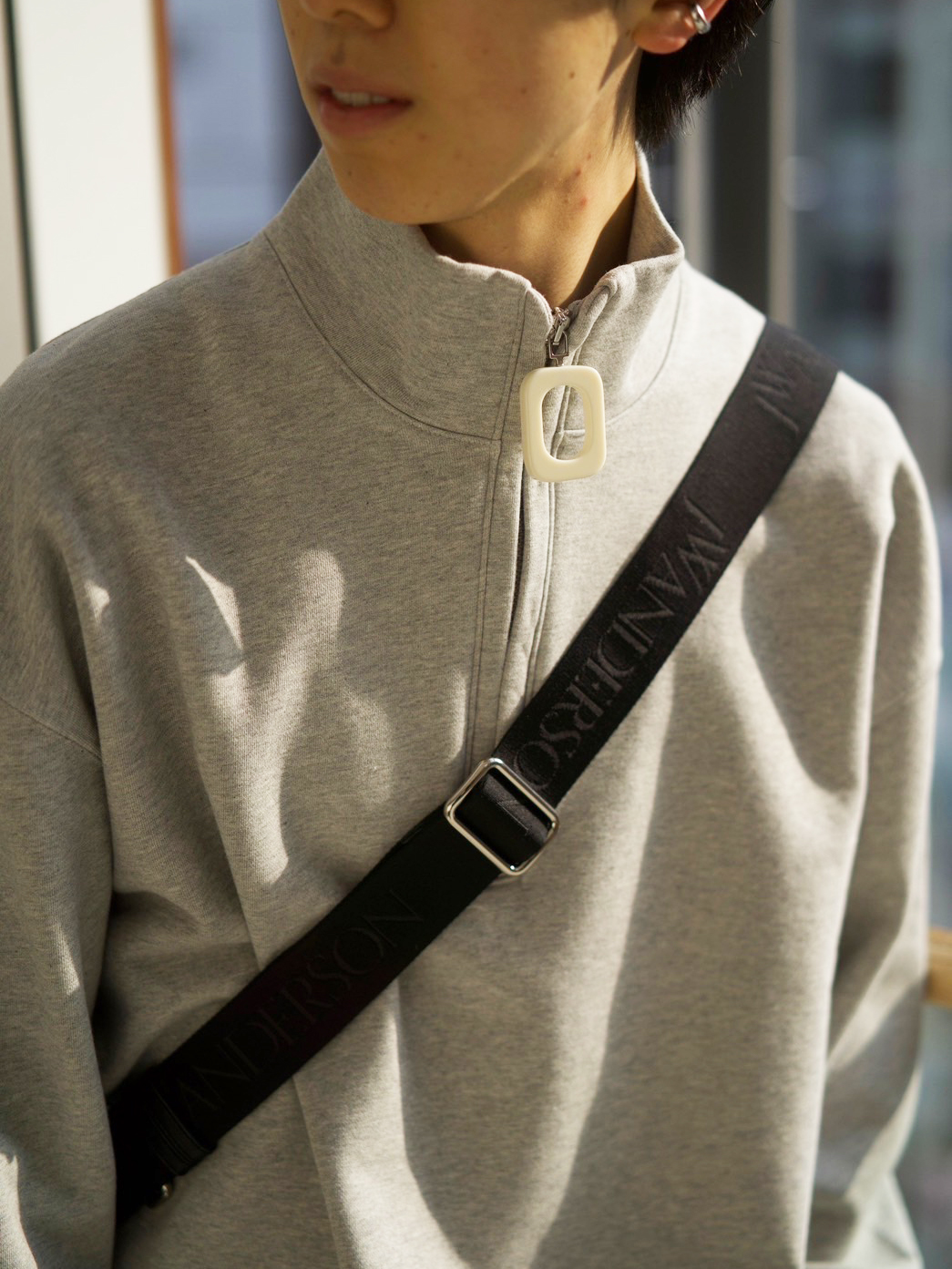 首元のパーツが特徴的なハーフジップのスウェットです。