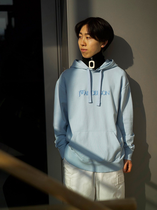 フェルトのようなロゴデザインに、太めの紐で、一般的なパーカーとは異なる存在感と高級感が漂います。