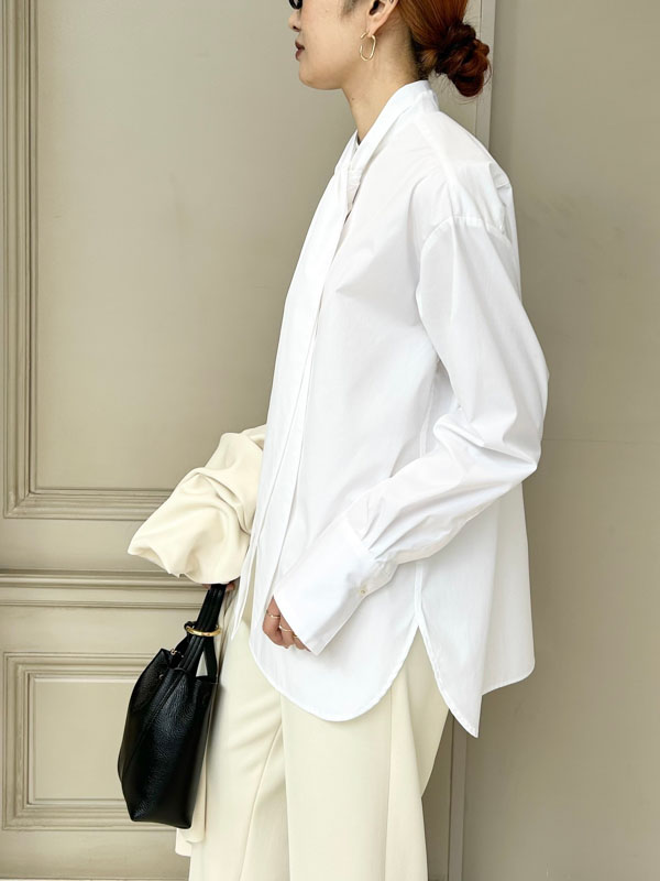 インナーに着たオーベルのボウタイシャツは、敢えて結ばず垂らすことをおススメします!