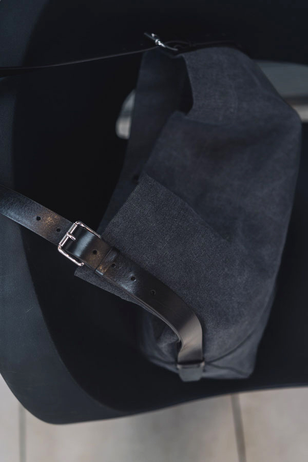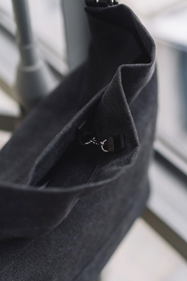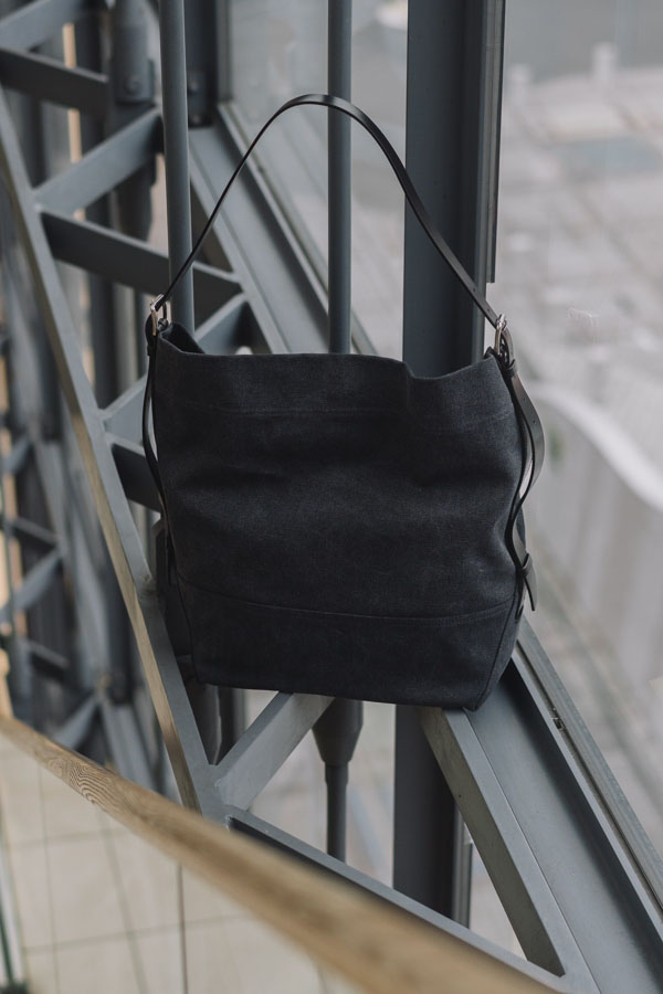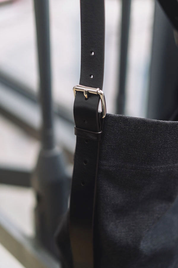 柔らかのある厚手のコットンキャンバス製で、微光沢のあるレザーストラップが側面から底までついており、デザインと補強になっています。