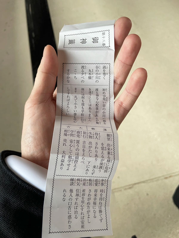 「初めは危ない谷の小川の橋を渡るような心配事があるが、後に平和に収まる。小さいことも用心すること。」というありがたい言葉も頂きました。