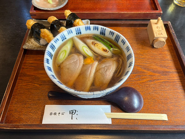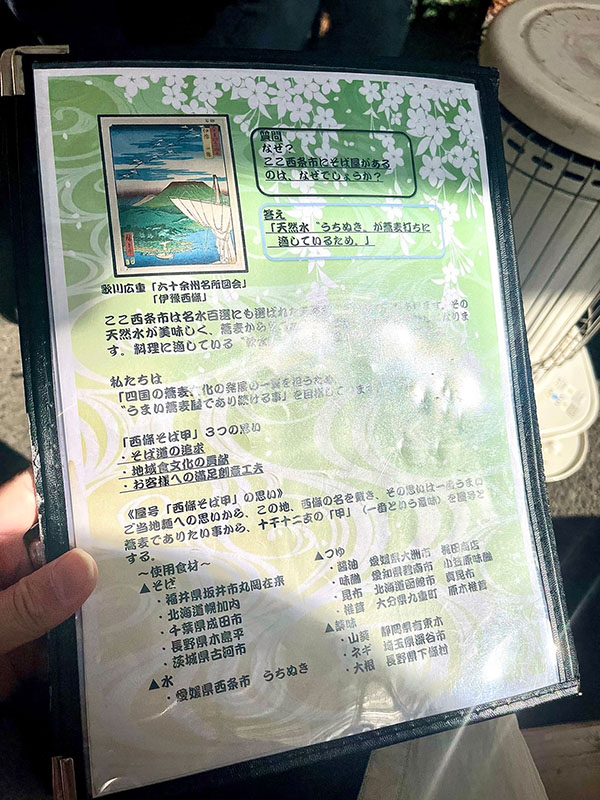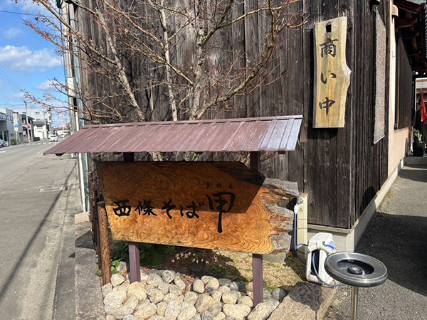 「西条そば甲」さんは自家製粉手打ちそばのお店で、名水百選に選定された地元の水「名水うちぬき」と、国産にこだわってセレクトしたそばの実を使って作られたお蕎麦は食感も良く絶品とのこと。
