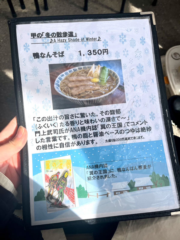 注文は迷いましたが、とても寒い日でしたので季節物の温かい鴨なんそばを。