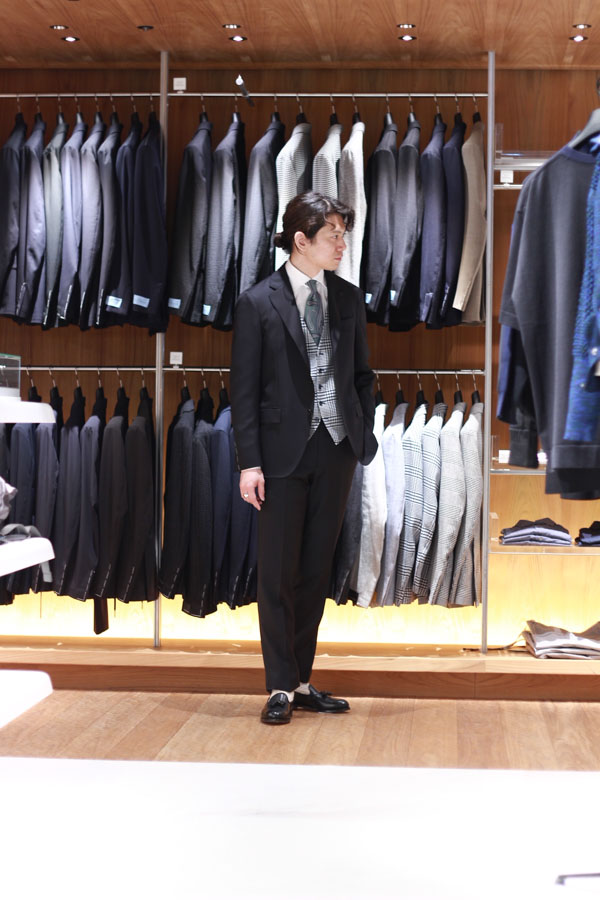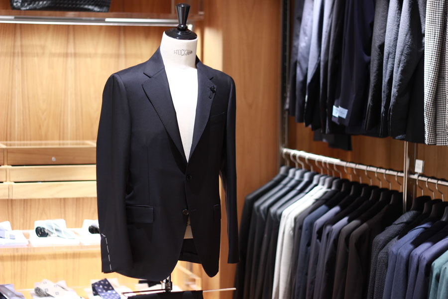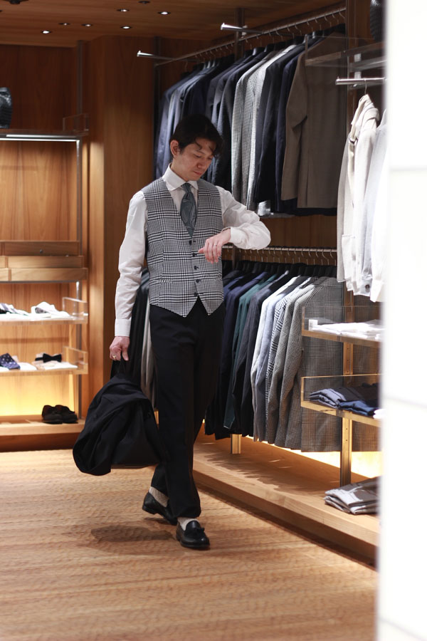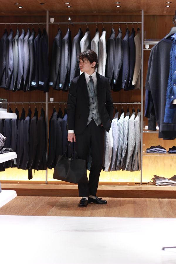 着用したスーツはLARDINI(ラルディーニ)。極めてソリッドな光沢ある綾織の生地は、誰がみても高級品だとわかる一着です。