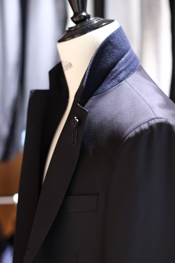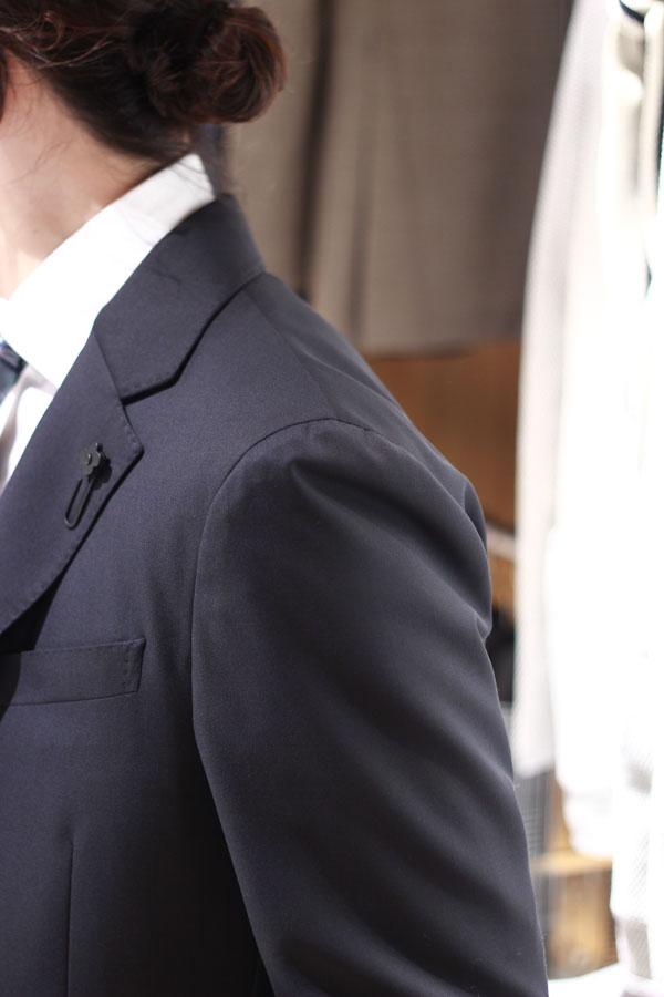 しかしながら着用者の首元、肩周りに綺麗に吸い付く立体的なジャケットの襟の仕上げや、スムースで摩擦を感じさせない腕どおり、丁寧に細かく入った肩のいせ込みにより、軽く感じてしまう本格派のサルトリアル仕様です。