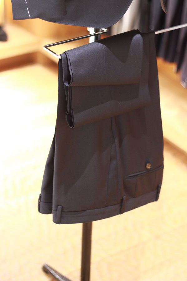 こちらのスーツ、生地は梳毛ウール100%のウーステッドのためストレッチはほとんどなく、パンツのウエストもゴム無しというストイックな作り。お世辞にも楽をさせてくれる作りではありません。