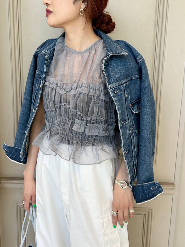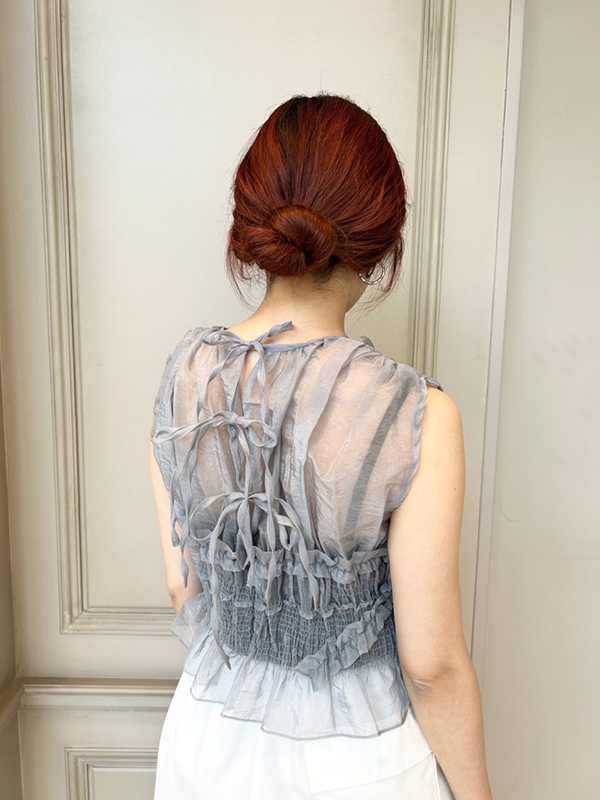 透明感のあるグレーが儚げな雰囲気を醸し出し、リボンとギャザーのディティールが女子心をくすぐる1枚。