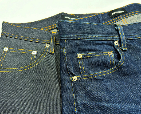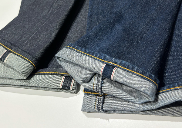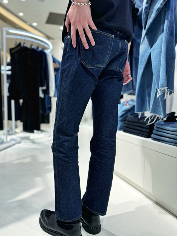 製品の状態で洗いが一度もかかっていないリジッド生地で、最初のパリパリの状態で洗わず長く履き込んでいくとデニム特有のアタリがよりはっきり出るのが特徴です。